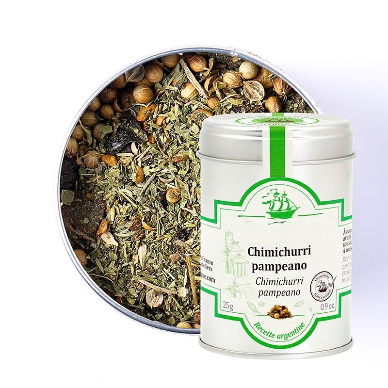 Le chimichurri pampeano est un mélange d'herbes et d'épices qui se compose de persil, ail, origan, coriandre, sel et piment. Il est utilisé en Argentine comme base de marinade ou sauce d'accompagnement pour les viandes cuites lors de soirées improvisées appelées "asados".