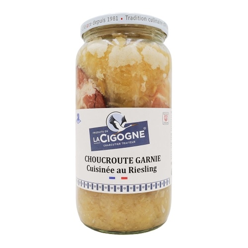 Choucroute 59% (chou, sel), échine de porc saumurée fumée 13% (viande de porc, eau, sel, vin blanc, plantes aromatiques, épices, conservateur E250), poitrine de porc saumurée 11% (poitrine de porc, eau, sel, dextrose, stabilisants (E451, E450), vin blanc, plantes aromatiques, épices, conservateur E250), knack et saucisse fumée 12% (viande de porc, eau, gras de porc, viande de boeuf, sel, plasma de porc, épices et extraits d'épices (contient MOUTARDE), dextrose, échalote, antioxydant E301, conservateur E250, ail, arôme naturel, oignon, poireau, enrobage: boyau de porc et de mouton), saindoux, Riesling 1.2%, épices et plantes aromatiques, sel, arôme naturel, antioxydant E300.