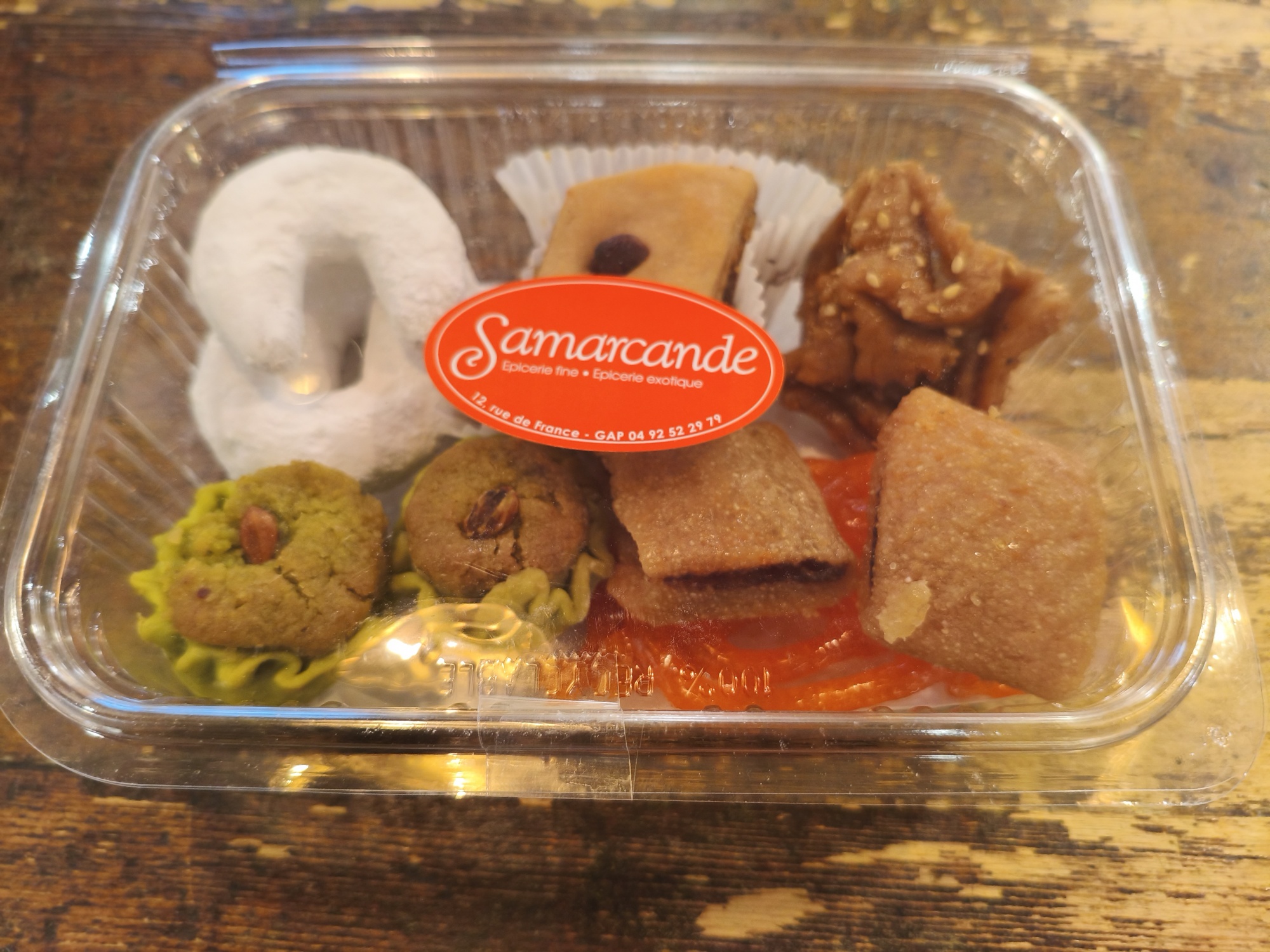 Baklava Tunisienne: sucre cristal, amande, eau, farine de blé, beurre, sirop glucose, œufs, huile tournesol, amidon maïs, acidifiant