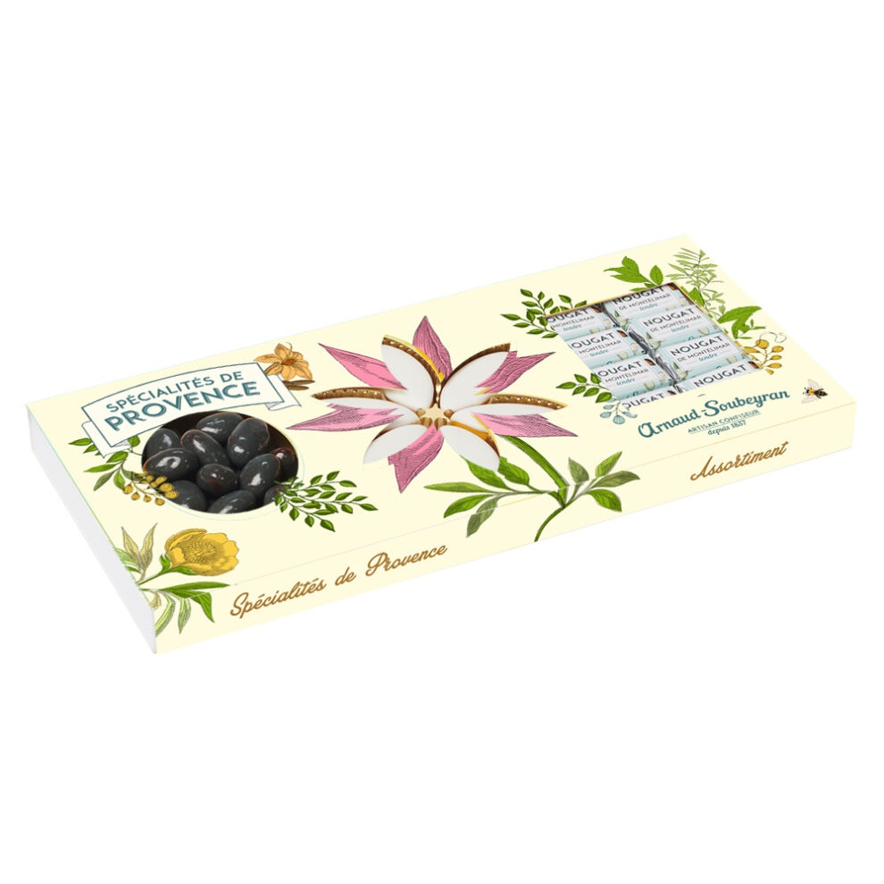 Olivettes du Midi : Chocolat noir (pâte de cacao, sucre, beurre de cacao, émulsifiant : lécithines (soja), arôme naturel de vanille), amandes, chocolat blanc (sucre, beurre de cacao, poudre de lait écrémé, matière grasse laitière, émulsifiant : lécithines (soja), arôme naturel de vanille), gomme arabique, gomme laque, colorants d’origine naturelle : bêta-carotène, indigotine, charbon végétal.